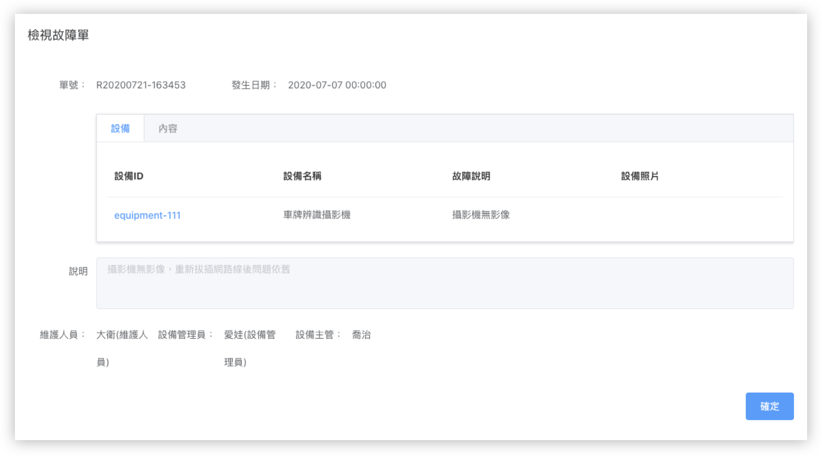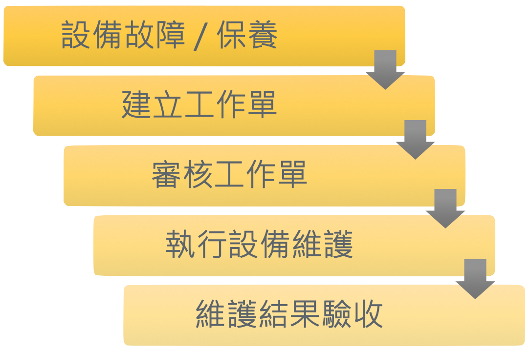 設備發生故障時,以最快時間發出工作單,並提供維護人員工作 SOP 以提升工作效、減少工安意外,使設備能於最短時間內恢復正常工作狀態。